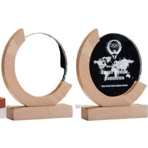 Trophée rond cristal avec contour et socle bois