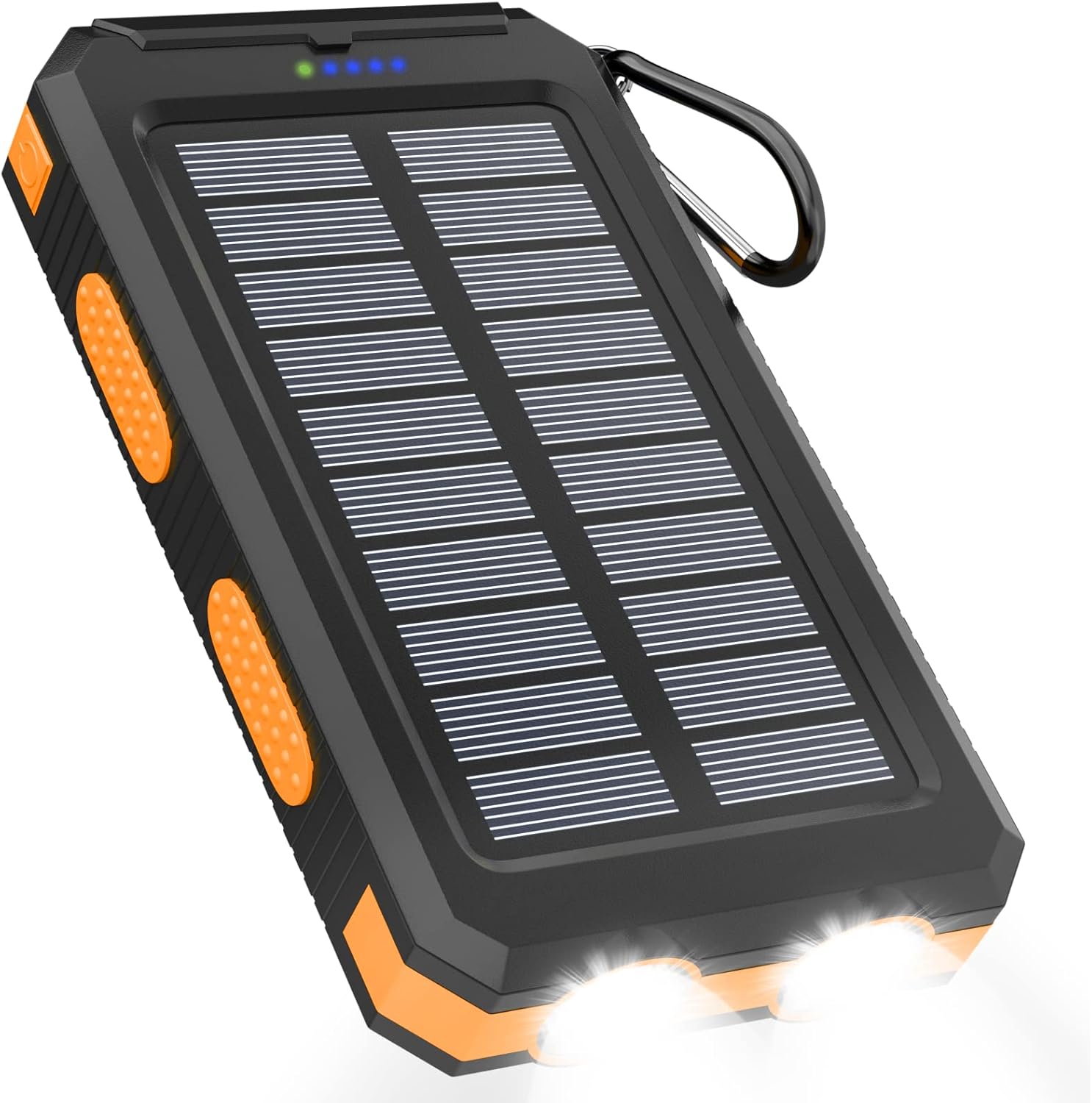 Chargeur solaire portable : cette batterie Li-polymère Power Bank est légère et de petite taille. Une batterie conviviale pour l’extérieur comme le camping, la randonnée et d’autres situations d’urgence utilisant ou de secours à l’intérieur, compatible avec les smartphones et autres appareils 5 V. Ce serait une bonne option pour un cadeau. Double lampe de poche et USB : la lampe de poche Steady-SOS-Strobe à 3 modes éclaire votre chemin, éclaire le camp, les randonnées dans l’obscurité ou signale l’aide en cas d’urgence en cas de panne de neige. Appuyez simplement (2 secondes) sur le bouton latéral et les lampes de poche s’allument. Cinq indicateurs sur le panneau montrent que l’état du chargeur de batterie est opportun. Ce chargeur de batterie solaire avec double USB peut charger 2 appareils simultanément. Conception durable et robuste : conception de chargeur de téléphone solaire pour les amateurs de camping en plein air. Fonctionnalités étanches, anti-poussière et antichoc avec boussole. Les doubles ports USB sont bien protégés par un capuchon en plastique solide qui les protège de la pluie et de la poussière normales. Bien dans votre paume ou dans votre poche et accrochez-les facilement dans votre sac à dos avec un mousqueton, un choix parfait pour l’intérieur ou l’extérieur. Double méthode de recharge : chargeur solaire pour téléphone portable alimenté par 5 V/2,0 A (micro USB) ou par la lumière du soleil. Mais lors de l’utilisation du panneau solaire, l’efficacité de la recharge est limitée. En réalité, l’efficacité des panneaux solaires est très faible. Assurez-vous de recharger à 100 % par câble Micro USB avant utilisation. Le vert s’allume lorsqu’il est chargé par un système solaire, le bleu s’allume lorsqu’il active le mode de chargement USB. Au quotidien, il sera préférable de la recharger via une prise murale et d’ACTIVER VOTRE BATTERIE QUELQUES FOIS lorsque vous commencerez à l’utiliser. Ce que vous obtenez : chargeur d’énergie solaire fabriqué en caoutchouc de silicone respectueux de l’environnement et en matériau ABS, avec deux lampes de poche, une boussole à l’arrière, un câble micro-USB et des accessoires mousquetons. Chargeur mural non inclus.
