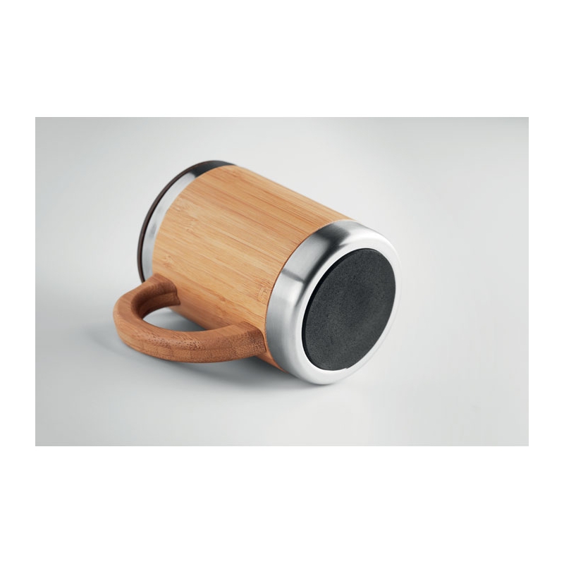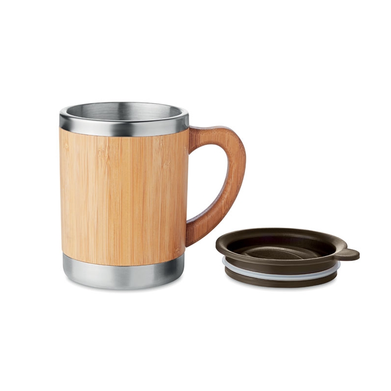 Gobelet publicitaire et personnalisable à double paroi avec revêtement en bambou et ouverture rotative.