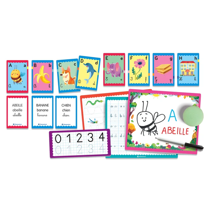 Un coffret amusant contenant 26 cartes illustrées, 3 ardoises, un feutre et une éponge pour apprendre à écrire.