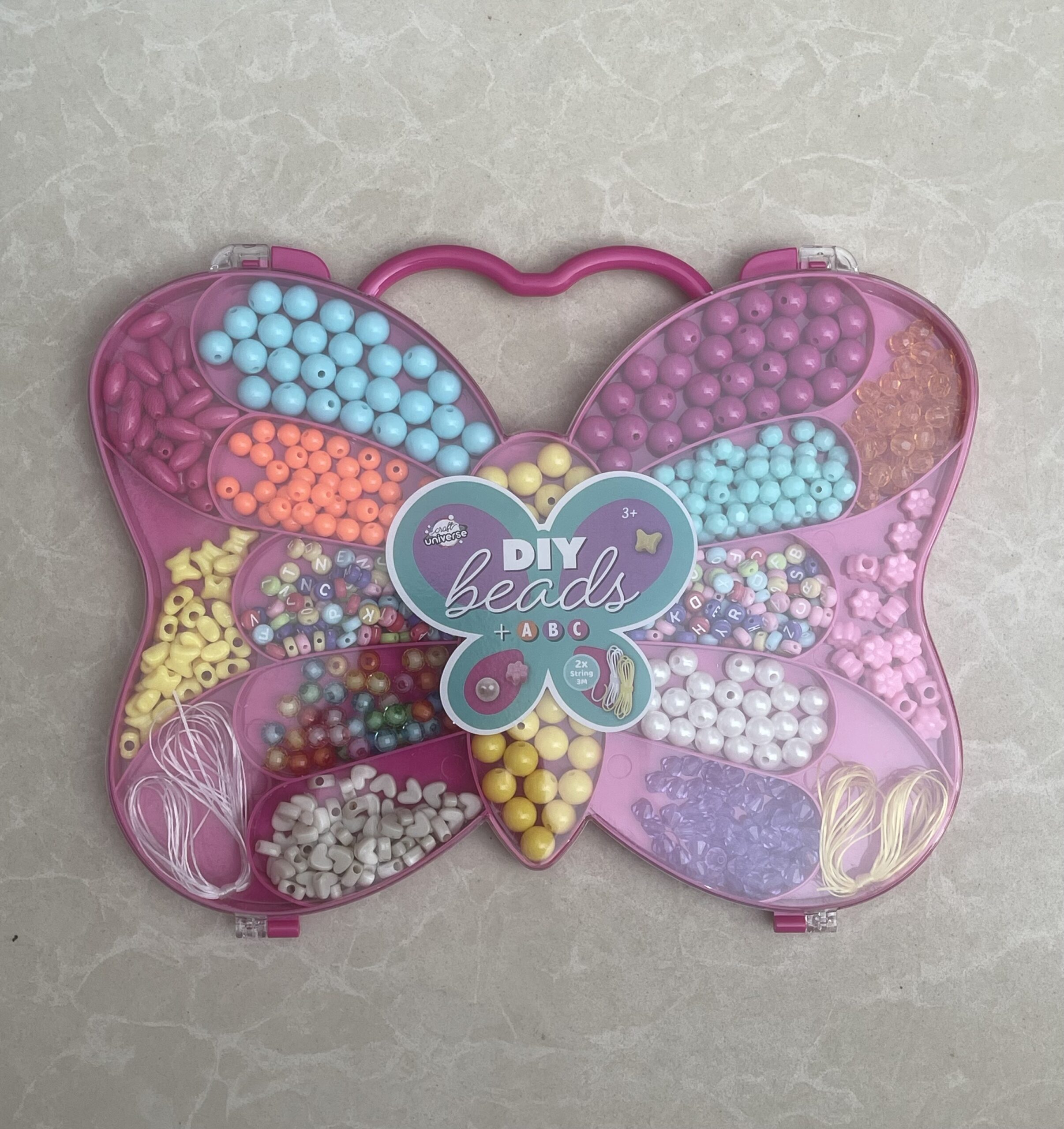 La boîte a un rangement intégré (boîte en forme de papillon) pour garder les perles organisées.