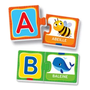 26 mini-puzzles illustrés à assembler pour apprendre les lettres de l’alphabet et les premiers mots.