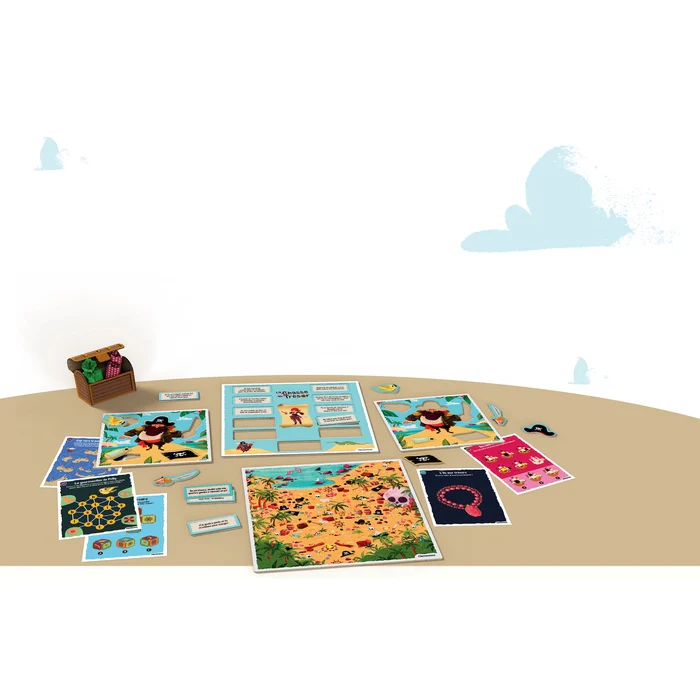 Certains indices décrivent des objets ménagers, créant ainsi une chasse au trésor personnalisée. Comprend un coffre au trésor dans lequel le parent place le trésor.
