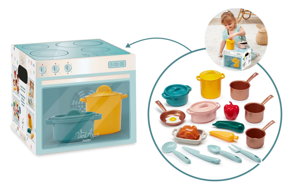 LA BATTERIE DES CHEFS : avec ces belles casseroles et sa boite de rangement servant de cuisinière, votre enfant aura de quoi préparer un bon repas !