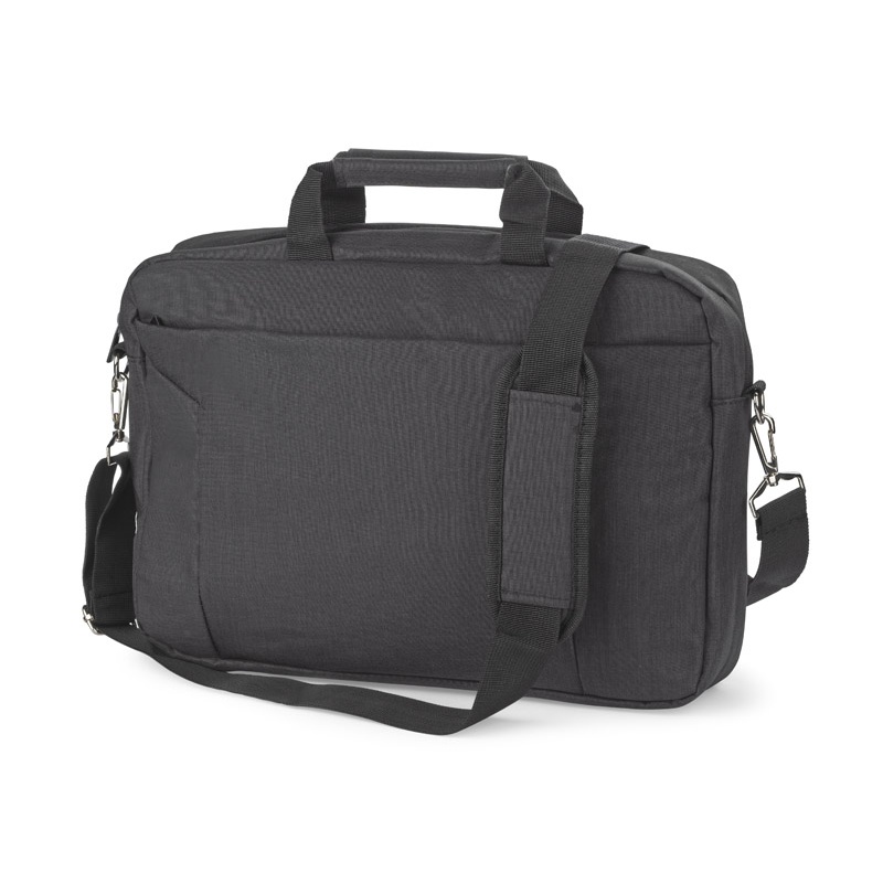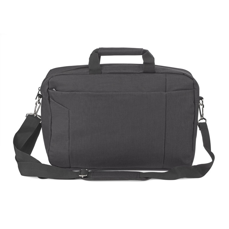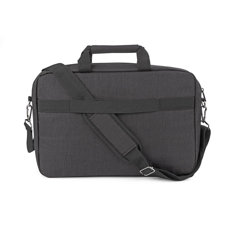 Sacoche classique pour ordinateur portable, elle accueillera un appareil à écran incurvé jusqu’à 15″. Il y a un seul septum dans la chambre principale. À l’extérieur du sac, vous trouvez une poche zippée avec trois compartiments. Il est livré avec une sangle qui vous permet de monter le sac sur votre valise. La bandoulière est réglable. Le sac est en polyester 600D.