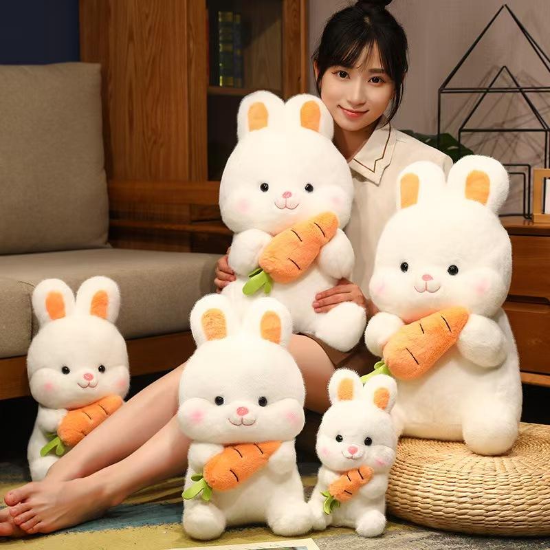 Craquez pour cette peluche lapin tout doux tenant sa petite carotte, un compagnon plein de tendresse qui fera fondre petits et grands. Fabriquée en super soft plush et rembourrée avec du coton PP, cette peluche est aussi moelleuse que réconfortante.