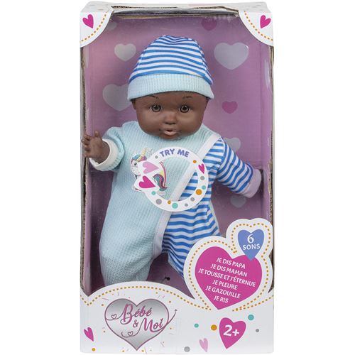 Poupon Lila. Metis 6 sons: Appuie sur son ventre elle dit : papa, maman, pleure, éternue, rigole, gazouille. Corps souple et yeux fixes. 30cm- 3 piles LR44/AG13 incluses.