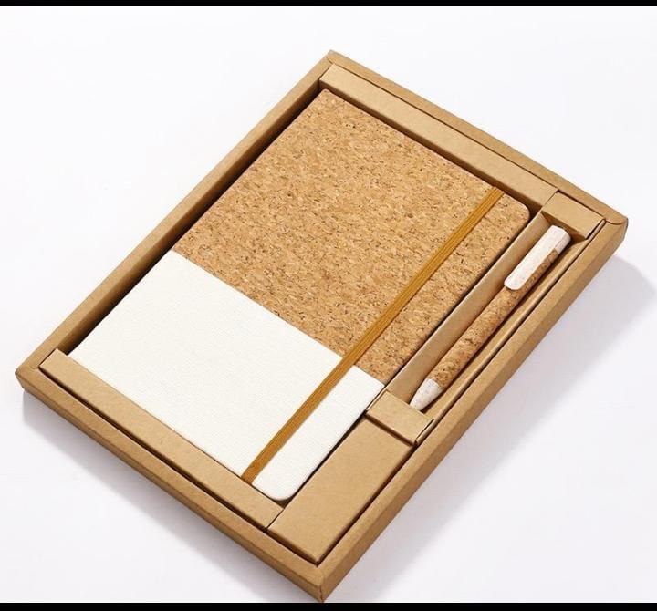 Carnet A5 avec stylo à bille écologique. Carnet cartonné en liège naturel, 80 feuilles de papier neutre. Le stylo à bille à poussoir est associé à un corps en liège naturel et à des accessoires en paille de blé pour encourager l’utilisation de matériaux naturels et réduire les émissions de polluants. Une boîte en carton au design respectueux de l’environnement. Encre noire.