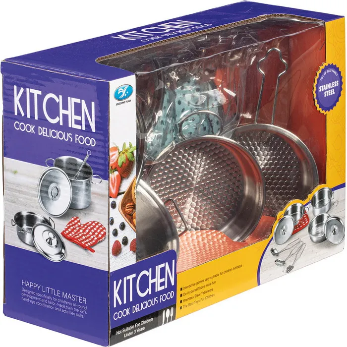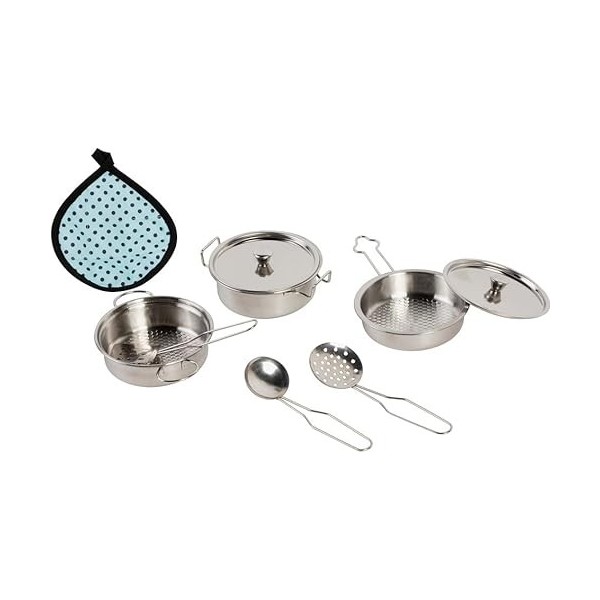 Set de cuisine 9 pièces en métal : 9 pièces en métal pour la cuisine comprenant une poêle et son couvercle, deux casseroles et un couvercle, une passoire, une spatule, une louche ainsi qu’une manique en tissu. Dès 3 ans.